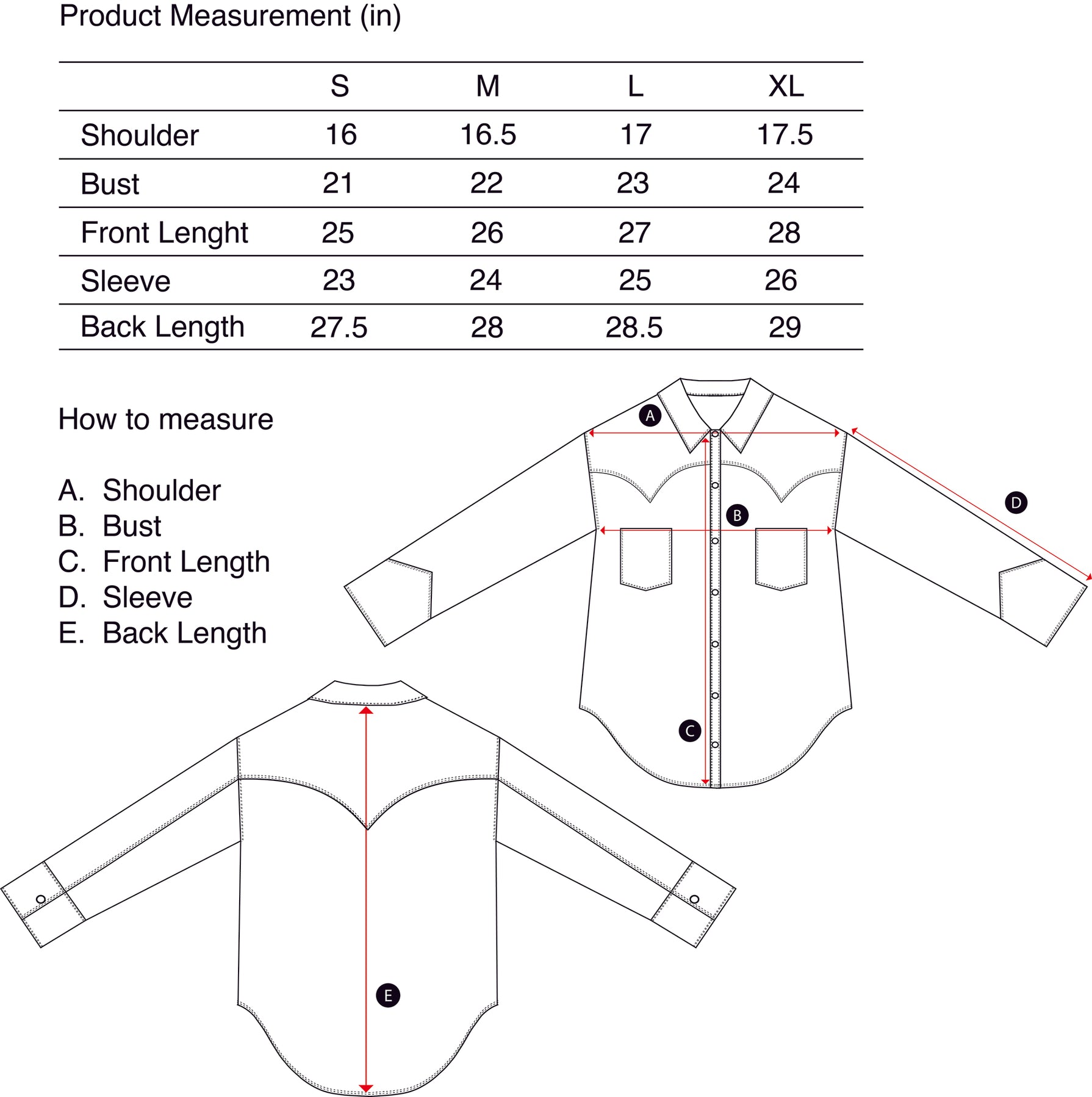 Western-inspired denim shirt with chest embroidery, pointed yoke details, and snap button closure.
