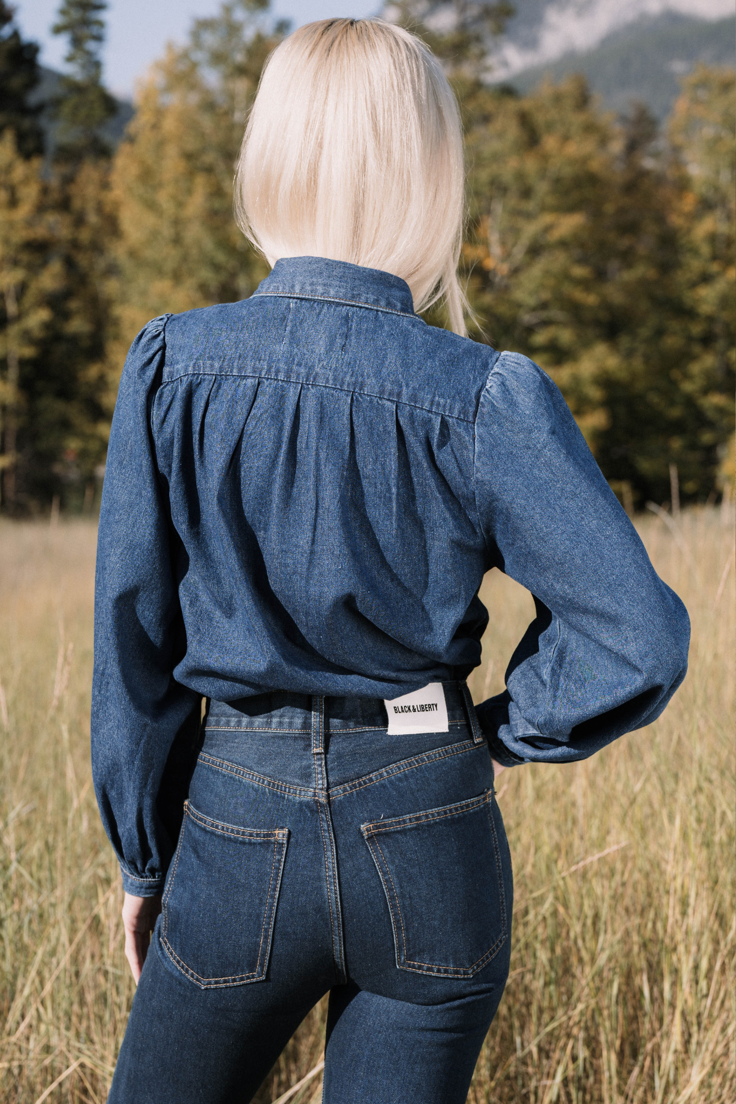 Designed with soft puffed sleeves, a relaxed fit, and subtle gathering details at the shoulders and back. Finished with a pointed collar and snap button closure.